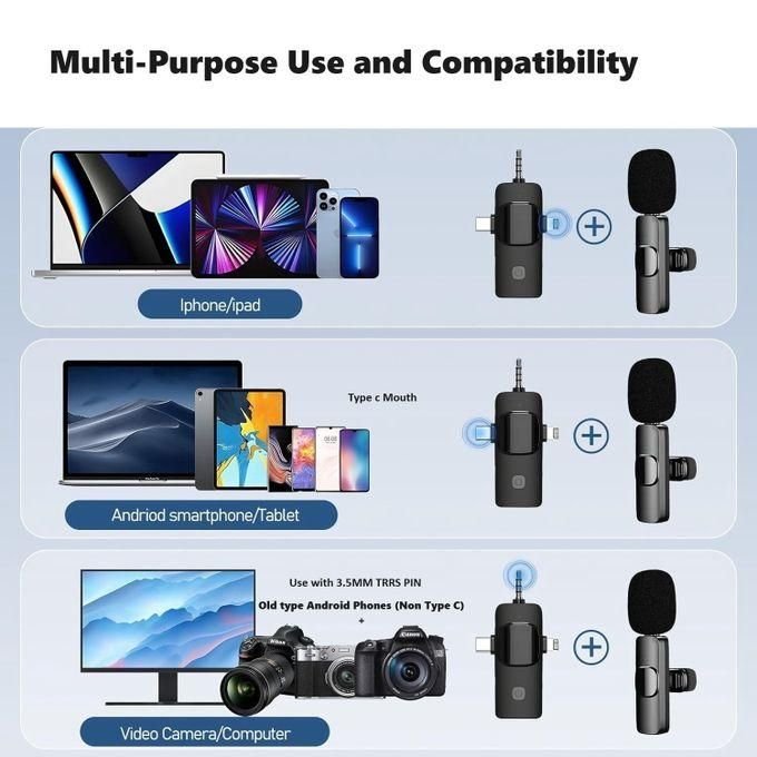 3 IN 1 Dual Wireless Lavalier Microphones is compatible with Most C-TYPE , IOS IPhone, Micro USB Android Phones, Laptops and DSLR.