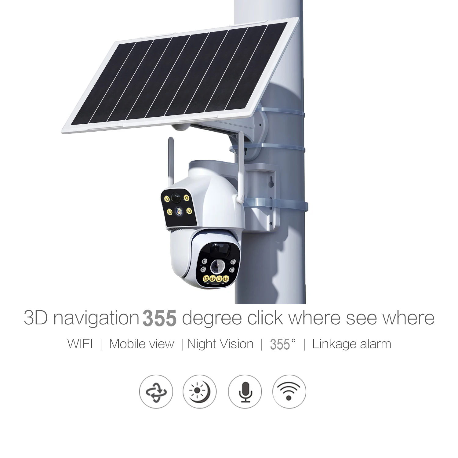 FEATURES: Auto Tracking, Motion Detection Two-way voice Audio Artificial Intelligence Built in Siren Alarm Night Vision with infrared light Cloud Storage Waterproof (all weather resistant) Rotates 360°H & 180 v Allows Multiple Users. Notably, Dual-Lens CCTV Camera With 4g Sim Memory, Solar Panel 8mp offers smart technology to secure your property.