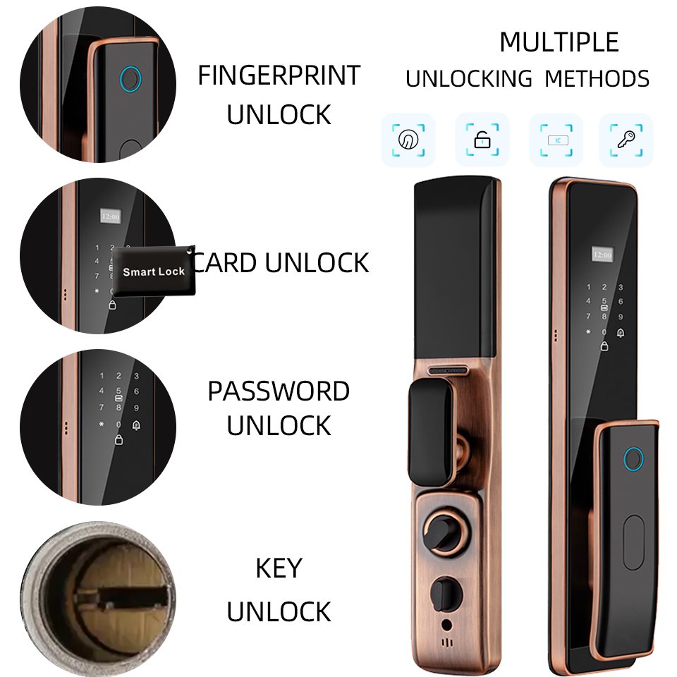 NGZ-51 Smart Door Lock Features Include: Remote unlocking Single camera lens 3D facial recognition Mobile app Smart cards Finger print Mechanical keys Passcode Camera HD screen Wifi Door bell Anti-theft security enabled Original Lithium Battery